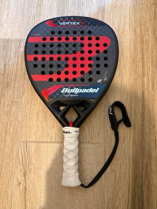 Pala de pádel Bullpadel Vertex 04. - Diseño en negro y rojo. - Incluye correa de seguridad. - Grip blanco. Como nueva, usada en 2 partidos. Peso fábrica: 364 gramos