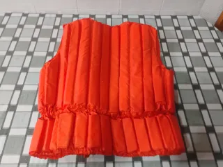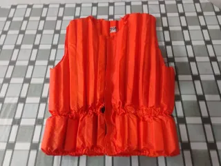 Chaleco salvavidas de color naranja brillante, diseñado para flotabilidad. - Cierre frontal con botón. - Cintura elástica. - Material de nylon.