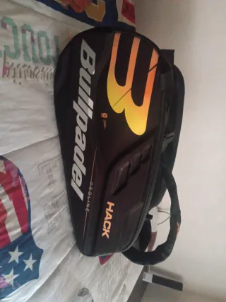 Paletero Bullpadel modelo Hack Proline en color negro. - Diseño moderno con detalles en naranja y amarillo. - Compartimentos amplios para palas y accesorios. - Asas acolchadas para mayor comodidad.