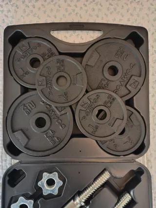 Set de mancuernas con un peso total de 16 kg. - Mancuernas en buen estado. - Incluye barras y discos. - posibilidad de mas discos
