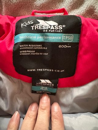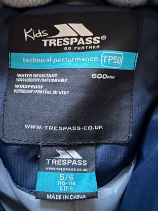 Conjunto de nieve para niños de la marca Trespass, con tecnología TP50. - Resistente al agua y al viento. - Tejido con rendimiento técnico. - Talla 3/4 (98-104 cm). Usado solo una vez