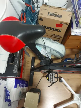 Bicicleta estática con asiento ergonómico. - Asiento con detalles en rojo y negro. - Estructura metálica. - Pedales con correas. Funciona bien solo se falta el cuentakilómetros x lo demás perfecta