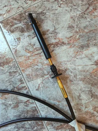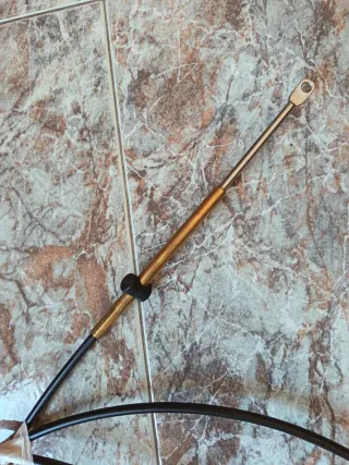 Cable de acelerador para motor fueraborda. - Longitud aproximada: 35 metros. - Conector metálico en un extremo. - Funda exterior negra. - Incluye abrazadera de goma negra.