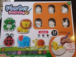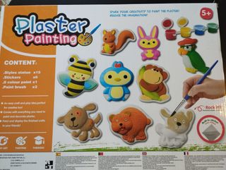 Kit de manualidades. Set pintar escayola. SIN USAR - 8 colores de pigmentos. - Incluye figuras de animales como un león, un elefante, una mariquita, una rana, un caracol y un pato. - Fomenta la creatividad y la motricidad fina.