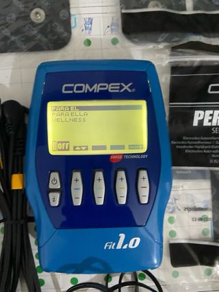 Electroestimulador Compex Fit 1.0 en buen estado. Incluye todos los accesorios. - Unidad Compex Fit 1.0. - Bolsa de transporte. - Cable de conexión. - Electrodos. - Manual de usuario. -Complemento de bolígrafo de electro estimulacion