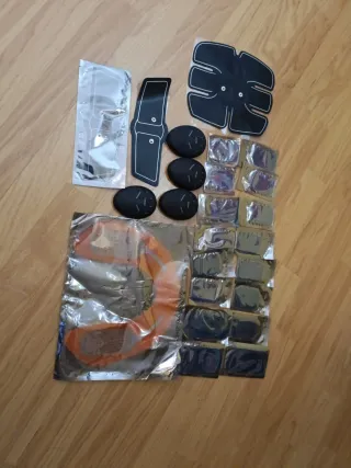 Nuevo, precintado. Color naranja. Viene uno grande para el abdomen y dos que pueden servir para los brazos, piernas, gluteos. Ems. Se carga con cable