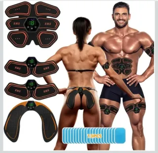 Set de electroestimuladores musculares para diferentes zonas del cuerpo. - Incluye parches para abdomen, brazos y glúteos. - Diseño ergonómico y fácil de usar. - Pantalla digital integrada en cada unidad.