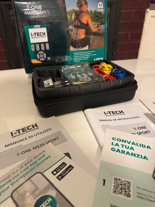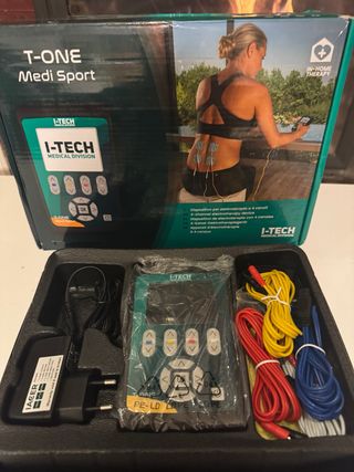 Electroestimulador I-TECH T-ONE Medi Sport SP 4 para terapia en casa. Incluye todos los accesorios. El mejor Electroestimumalador con 100 programas Electroestimulador con pantalla gráfica a color 4 cables de conexión de electrodos (8 electrodos conectables) Electrodos adhesivos cuadrados pregelificados Electrodos adhesivos rectangulares pregelificados Electrodos adhesivos redondos pregelificados Kit de iontoforesis Batería recargable NI-MH Cargador Manual de uso y mantenimiento Manual de posición del electrodo Bolsa de transporte
