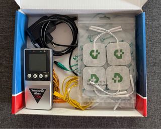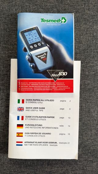 Electroestimulador muscular Tesmed Max 830. Apenas se ha usado, en muy buen estado (el frontal de la caja tiene un poco de papel de regalo) - Incluye electrodos. - Cargador de corriente.