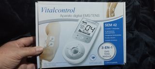 Vendo electroestimulador muscular Vitalcontrol SEM44, en perfecto estado. Es un aparato digital EMS/TENS que ofrece 3 funciones en 1: entrenamiento y regeneración muscular (EMS), alivio del dolor (TENS) y masaje. - 2 canales y 4 electrodos. - 64 aplicaciones preprogramadas. - 6 programas individualizables. - Incluye indicador de colocación de electrodos y contador de tiempo.