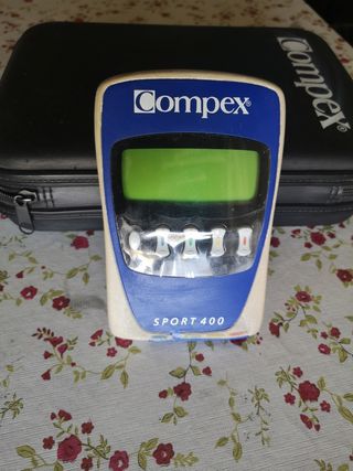 Electroestimulador Compex Sport 400 usado, en buen estado. Se incluye el aparato, accesorios y su estuche para transporte. Tiene la carcasa desgastada, pero funciona perfectamente. Se ha usado muy poco.