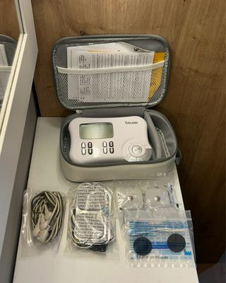 Electroestimulador digital de la marca Beurer, ideal para el bienestar personal. Incluye accesorios para su uso. - Pantalla digital. - Botones de control. - Incluye funda de transporte. - Auriculares incluidos.