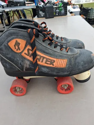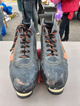 Estos patines de hombre presentan un diseño clásico en color gris con detalles en naranja. - Cordones a rayas negras y naranjas. - Ruedas rojas y blancas.