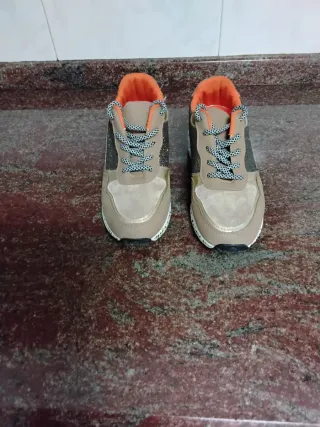 Zapatillas de mujer en color beige y detalles en gris y naranja. Perfectas para el día a día. - Cierre con cordones. - Suela de goma. - Forro interior naranja.