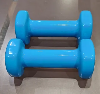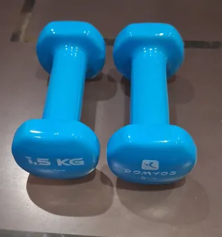 Par de mancuernas de 1.5 kg cada una, en color azul brillante. Perfectas para entrenamientos en casa. - Peso: 1.5 kg por mancuerna. - Color: Azul. - Marca: Domyos.