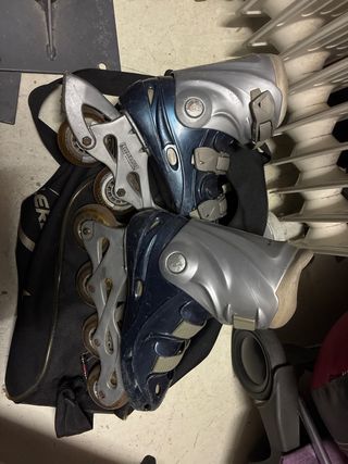 Se venden patines en línea en talla 42. Son cómodos y están listos para usarse. - Diseño en azul y negro. - Cierre de velcro y hebilla. - Ruedas ABEC 5. Incluyen protección