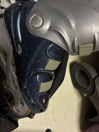 Se venden patines en línea para adulto, ideales para desplazamientos o deporte. - Diseño en color azul y plateado. - Cierre con correas. - Ruedas de patinaje en línea.