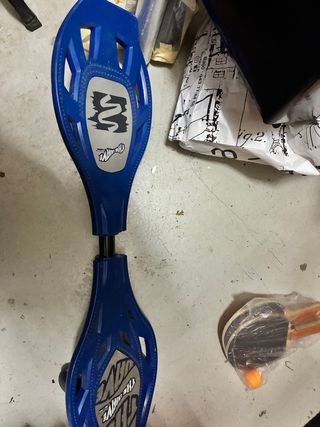 Hoverboard de color azul brillante, con un diseño moderno, práctico y con luces a las esquinas al montarte. - Plataformas antideslizantes. - Asa central para facilitar el transporte. - Dos luces indicadoras frontales.