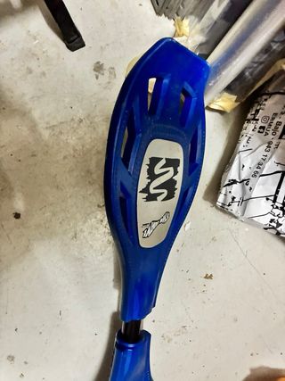 Patinete de dos ruedas en color azul, con diseño deportivo. - Plataformas con agarre. - Ruedas negras.