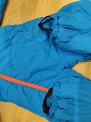 Buzo de esquiar para niños, de color azul con detalles en naranja. Ideal para proteger del frío y la nieve. - Talla 83-90cm - Cremallera frontal naranja. - Capucha con forro interior naranja. - Puños elásticos en las mangas. - Trabillas para los pies.