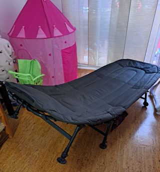 Cama plegable, ideal para pesca, camping, salidas al aire libre o como cama extra. Muy bien cuidada. - Estructura metálica resistente. - Bien acolchada. - Patas ajustables y regulables, con apoyo giratorio. - Refuerzo en zona de calzado de fácil limpieza. Precio negociable.