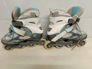 Patines en línea para patinaje. - Color gris, blanco y azul. - Cierre con cordones y velcro. - Ruedas de poliuretano. - Están en perfectas condiciones