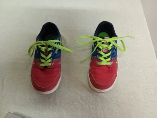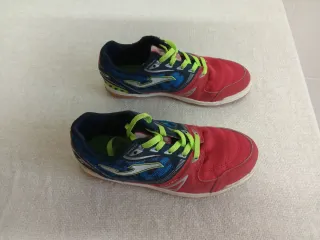 Zapatillas deportivas Joma para niño o niña, con un diseño moderno y llamativo. - Color principal rojo con detalles en azul y verde. - Cierre con cordones. - Suela de goma. - Logo de la marca visible.