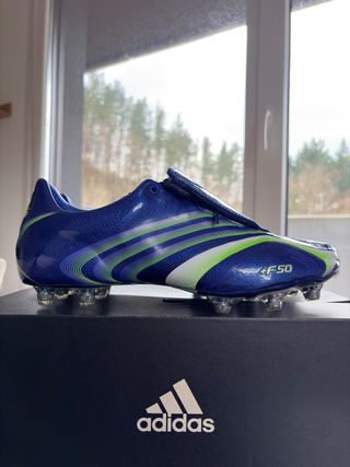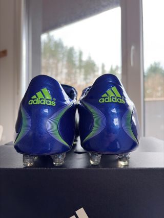 Botas de fútbol Adidas F50 Tunit del año 2006. Diseño en azul con detalles en verde y blanco. Tacos intercambiables solo dispongo de plastico para jugar en hierba natural y artifical ultima generacion. Impolutas ideal para coleccionista.