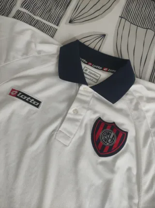 Camiseta de fútbol del Club Atlético San Lorenzo de Almagro. - Color blanco. - Logo de Lotto en el pecho. - Escudo bordado del club en el pecho. - Detalles en las mangas.