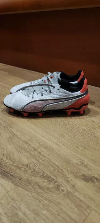 Botas de fútbol Puma King para niño. Combinan un diseño moderno con detalles llamativos. Talla 32. Los tacos como nuevos. Son faciles de poner y muy comodas, se le han quedado oequeñas rapido. - Exterior en tonos grises. - Detalles en color rojo. - Suela con tacos para césped.