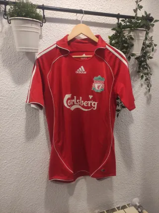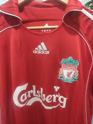 Camiseta de fútbol del Liverpool FC de la temporada 2006/2007, con nombre Alonso y número 14. - Diseño clásico en color rojo. - Logo de Adidas y escudo del club bordados. - Patrocinador principal Carlsberg impreso en el frontal. Talla S, pero medidas similares a una M. 70cm de largo x 51cm de pecho