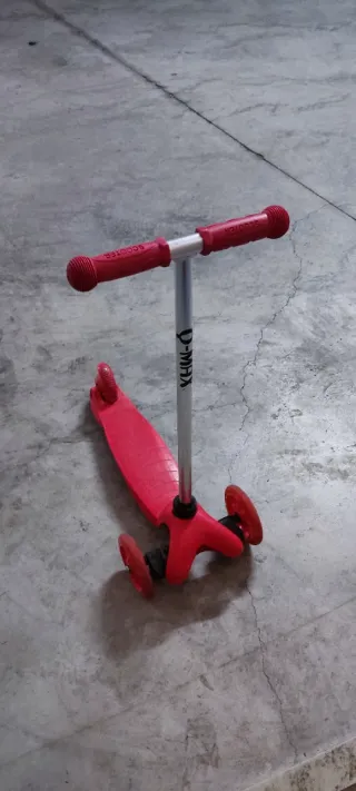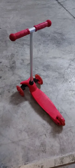 Patinete infantil de tres ruedas en color rojo. Al girar las ruedas se iluminan. Manillar desmontable. Freno correcto.