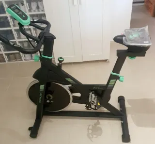 Bicicleta estática profesional para spinning. Diseñada para entrenamientos intensos y cómodos. - Estructura robusta y estable. - Manillar ajustable. - Sillín ergonómico. - Pantalla digital para seguimiento de métricas.