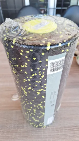 Rodillo de masaje para ejercicios de recuperación muscular. Su diseño texturizado ayuda a masajear diferentes grupos musculares. - Color: Negro con puntos amarillos. - Material: Espuma. - Incluye etiqueta con código de barras.