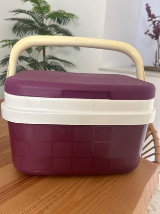 Nevera portátil de 10 litros con asa para facilitar su transporte. Ideal para mantener tus bebidas y alimentos frescos. - Color morado y blanco. - Asa plegable de color crema. - Diseño con textura. - Capacidad de 10L. Nevera muy poco uso, el unico imperfecto el que se ve en la foto, por lo demas perfecta. Plastico bastante bueno y resistente.