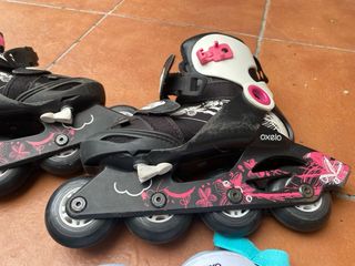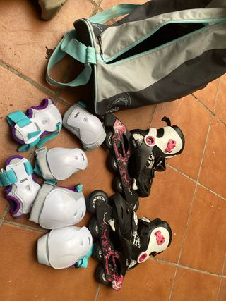 Conjunto completo para patinar con protecciones y bolsa de transporte. - Patines Oxelo. - Juego de protecciones (muñecas, codos, rodillas). - Bolsa de transporte Oxelo. Tener en cuenta que a uno de los patines le falta el freno. Es facil y barato conseguir en Decathlon. Talla 32-34. Son regulables y se incluyen tornillos