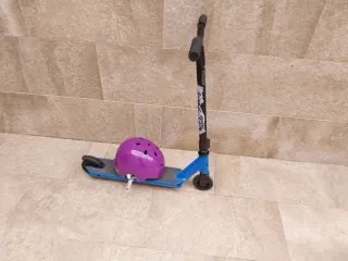 Patinete de color azul con un casco morado. - Patinete con ruedas negras. - Casco de protección morado con ventilación.