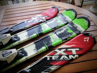 Dos pares de esquís con bastones. El precio incluye las 2 parejas 1) Es un Rossignol Oversize 9S característico de la gama de pista carving de Rossignol. Es un modelo orientado a giros cortos/medios en nieve dura. 2) Rossignol Actys 100 (blanco/rojo) Modelo de pista polivalente y fácil de manejar.