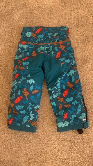 Pantalones de esquí con divertido estampado de animales y letras. - Estampado multicolor sobre fondo azul. - Parches de refuerzo en las rodillas. - Cierre de velcro en la cintura. Iban junto a una chaqueta que si, se usó, los pantalones solo 1 vez. Perfecto estado