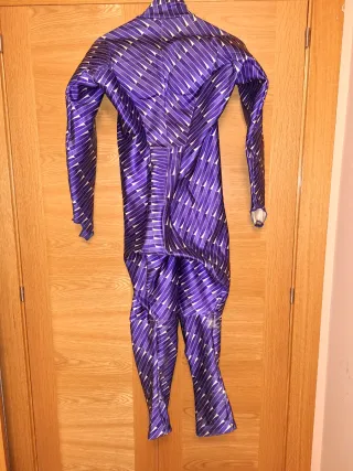 Mono de esquí de competición con un llamativo diseño azul y blanco. - Diseño de rayas diagonales blancas sobre fondo azul. - Cremallera frontal completa. - Marca Descente visible en la pierna. - Puños y tobillos elásticos. Uso de 1 temporada