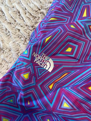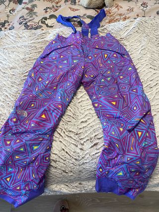 Pantalón de esquí The North Face para niña con un llamativo estampado geométrico. - Diseño con tirantes ajustables. - Estampado multicolor sobre fondo morado. - Parte inferior de las perneras con puño elástico.
