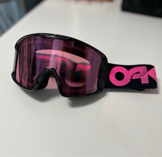 Máscara de snowboard Oakley Line Miner con lentes PRIZM. - Montura negra. - Correa con diseño de letras grandes en rosa y fondo negro. - Lente rosa con acabado espejo. - en perfecto estado. - se entrega con su caja y bolsa transporte