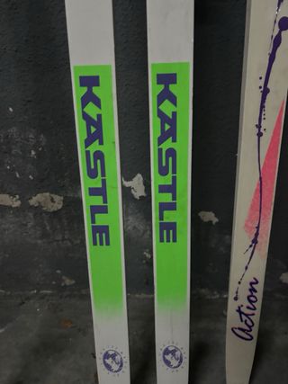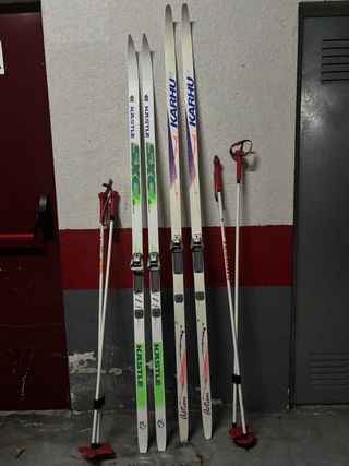Conjunto de esquís de fondo Karhu y Kastle, listos para la nieve. - Esquís Karhu con diseño en morado y rosa. - Esquís Kastle SXC con diseño en verde. - Bastones de esquí incluidos.