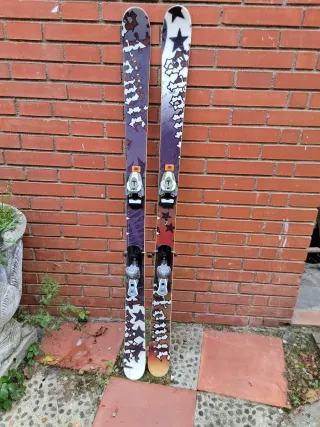 Esquís Salomon para estilo libre y freeride. Presentan un diseño llamativo con detalles dorados y motivos gráficos. - Marca: Salomon - Estilo: Freestyle/Freeride - Diseño: Gráfico con detalles dorados - 174 cm largo y 108 de patin