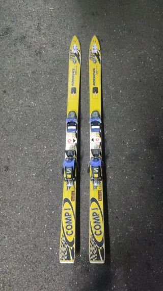 Esquís Rossignol Comp J para niños. Perfectos para iniciarse en el esquí. - Esquís amarillos con diseño deportivo. - Fijaciones Salomon. - Marca: Rossignol. - Modelo: Comp J. 145cm