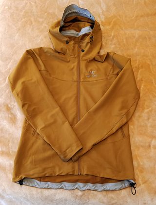 Chaqueta Arc'teryx Gamma LT Hoody para hombre. Diseño moderno y funcional. Softshell con alguna marca de uso, en mangas y una reparación en el hombro. - Color marrón ocre. - Capucha ajustable. - Cremallera frontal. - Bolsillos laterales con cremallera.