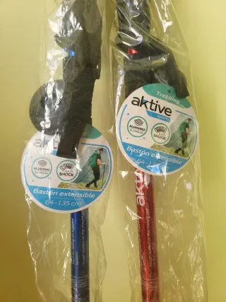 Par de bastones de senderismo de la marca Aktive Sports de aluminio, ideales para tus rutas y caminatas. - Color azul y rojo. - Material: Aluminio. - Diseño extensible telescópico 64 a 135cm. - Empuñaduras ergonómicas. - Precio en tienda 14,95€ la unidad. Dejo los dos por 20€. - Están sin estrenar.