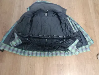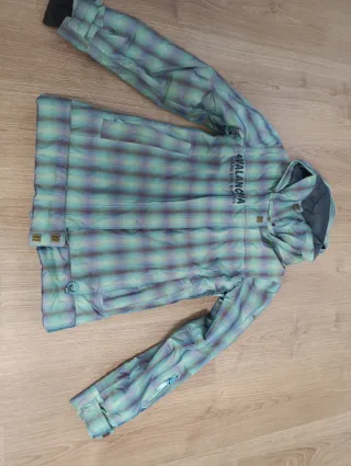 Chaqueta de esquí Roxy para mujer talla S con un diseño a cuadros en tonos verdes y morados. Ideal para disfrutar de la montaña. - 10000 K de agua - Diseño a cuadros. - Capucha integrada.