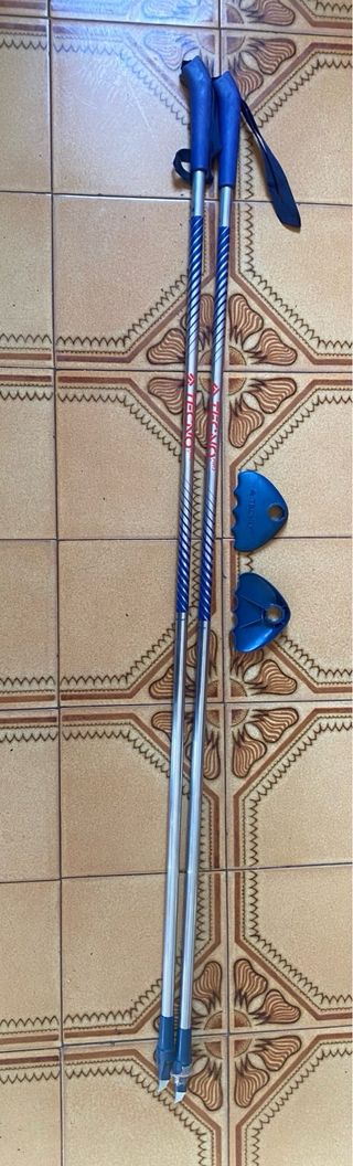 Par de bastones de senderismo Techno Pro. Ligeros y resistentes, ideales para tus rutas. - Mangos ergonómicos de color azul. - Incluye dos puntas de repuesto. - Diseño con detalles en espiral azul y plateado.