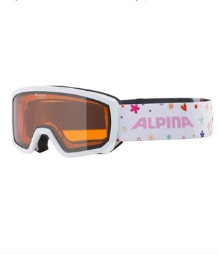 Gafas de esquí Alpina para niños con un diseño divertido y colorido. - Correa ajustable con estampado de corazones y flores. - Lente naranja para mejorar la visibilidad. - Montura blanca.